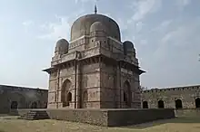 - π Tomb and Mosque between Chorkot and Chhappan Mahal. This is south of Ek - khamba Mahal. The complex is on the main road and for persons travelling south it will be on his right side. The complex consists of a square tomb topped with a dome along with a three domed mosque in the back. Nothing is known about the occupant of the tomb.