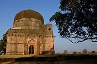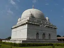 - π Unknown Tomb (Adhar Dome). On the western side of the Dai ka Mahal lies a massive domed structure, which the Archaeological survey of India (ASI) describes as the Unknown Tomb. While some historians mention it as the Adhar Dome. Here also nothing is known about the occupant of the massive tomb. It is a two storied structure with a flight of stairs on the south side. The remaining three sides have seven arched entrance each. The stairs lead to the top of the first level which acts as a platform of the tomb, which is on the second level. The square tomb has arched entrance on all four side and is topped with a massive tomb. This is the largest and the most prominent structure of the Sagar Talao group.