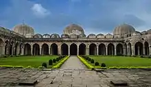 - π Jami Masjid (Opposite Ashrafi Mahal). A largest and the chief mosque of Mandu. The construction of the mosque began during the reign of Hoshang Shah and was completed by Mahmud Khalji. The Jami Masjid in Mandu was modeled after the Mosque of Damascus. It is approached through a huge domed gateway on the east. The door has marble jams and lintel, which probably are reminiscent of Hindu architecture. A passageway through the gate leads to a open courtyard with flanked on three side (except west) by pillared halls, most of which have long collapsed. Straight ahead on the western side is a main prayer hall crowned with three gigantic domes, along with 58 small domes. The paryer hall consisting of an amazing amalgamation of pillars and arches have 17 curved niches on the western wall. The elaborately decorated central marble niche serves as the main mihrab of the mosque. Just next to the main mihrab is a domed pulpit, approached by a flight of stairs. The imam lead the prayers from this pulpit.