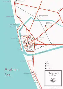 - 🌍 Mangalore International Airport (IXE IATA) (at Bajpe, about 20 km (12 mi) from the city centre). There are daily flights to Mumbai, Bangalore, Goa, Kochi, Hyderabad, Chennai, Surat, Delhi and Calicut in the domestic segment and weekly/bi-weekly flights to Dubai, Abu Dhabi, Muscat (Oman), Doha (Qatar), Kuwait and Bahrain in the international segment. Air India, Spice Jet, and Air India Express operate flights to Mangalore.