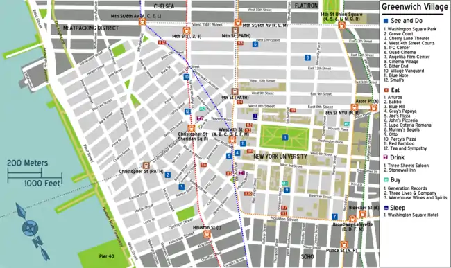 Greenwich Village (often referred to as "West Village" or simply "the Village") is a well-known, largely residential district in Manhattan, once famous for its vibrant art and literary community. Nowadays the neighborhood is so gentrified that the artists and poets who once lived here wouldn't be able to afford the rents, but the Village is still worth a visit for its lovely tree-lined streets and colorful history. Centered around Washington Square Park and the campus of New York University (NYU), the neighborhood sits west of Broadway between Houston Street and SoHo on the south and 14th Street and Chelsea on the north.
