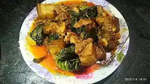 - Morok metpa is a coarse-paste prepared with green or dry red chillies. They should be boiled with ngari in a pan and then it should be mashed with salt; fried fish pieces can also be added to it. chopped onions and coriander leaves should be added to it and mixed. Other dishes are- kang-hou (various vegetables fried dry in oil with traditional spices), paknam (fish cake), nga-thongba (fish curry), ooti, pakora thongba, chagem pomba, keli chana, alu kangmet (boiled potato mashed with fried red chilli and salt and dressed with mustard oil), sana thongba which is prepared with paneer in Manipuri style, a-nganba (steam vegetables, such as pumpkin, sweet pea, carrots, and French beans).
