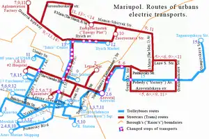 Include: bus transportation, trolley-buses (14 routes), trams (12 routes) & fixed-route taxis. Install the App "City Bus Mariupol" which shows all buses and minibuses in real time. (10/2019)