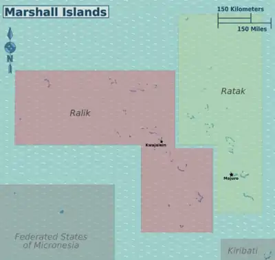 | Ralik The western island chain consists of: Enewetak Atoll, Ujelang Atoll, Bikini Atoll, Rongdrik Atoll, Rongelap Atoll, Ailinginae Atoll, Wotho Atoll, Ujae Atoll, Lae Atoll, Kwajalein Atoll, Lib Island, Namu Atoll, Jabat Island, Ailinglaplap Atoll, Jaluit Atoll, Kili Island, Namdrik Atoll and Ebon Atoll |