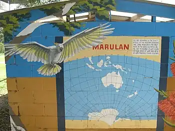 The toilet block in Marulan is painted with a mural symbolising the town's placement on the 150ยบ meridian.