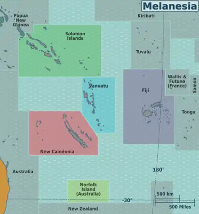 Geographically, the Australian island territory Norfolk Island is situated in Melanesia, although no ethnic Melanesian people ever settled there: