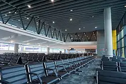 Terminal 4 is a terminal built for budget airlines with self-service check-in and bag drop facilities. Terminal 4 requires a fairly lengthy walk to the boarding gates from the security check-point and departure lounge. There are no travellators (moving walkways) and there is very little seating along the walk and at the boarding gate areas. The terminal centres around the departures lounge area, with screens not showing the departure gate until the flight is ready to board. Passengers should pass through security and wait in the departure lounge area until the screens indicate that it is time to go to the gate. The departure lounge has seating, a food court and various retail outlets.