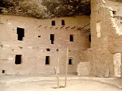 A pine pole ladder sticks out of the top of a kiva, or place of meeting and worship. In the background, keyhole-shaped doors lead to multilevel dwellings.