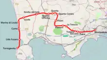 The Circumflegrea Circumflegrea be considered the western counterpart of Circumvesuviana since runs towards localities situated in the volcanic area of Phlegraean Fields. The service consists in a single line connecting the terminal station of π Napoli Montesanto (in the middle of the old town) to Torregaveta, on the Gulf of Gaeta. In 2018 the line was fully operational only until the station of Licola, but the final section is open on sunday and particular dates from 22 May to 30 October to allow visiting the archaeological site of Cumae. Check for more info