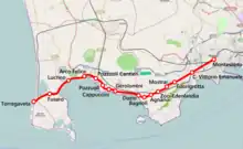 (Naples-Salerno) β Runs for 50 km (31 miles) through Portici (10 min), the sites of Herculaneum (15 min) and Pompeii (25 min), to arrive in Salerno in 40 minutes boarding the Amalfi Coast.