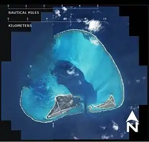 Midway is part of the extended series of Pacific islands which include Hawaii. It is an atoll of several low, sandy islands. The two largest are Sand Island (the most developed) and Eastern Island (not to be confused with Easter Island), with the smaller Spit Island between them. A coral reef which nearly encircles them (one of the most northerly coral formations of this kind). The three largest islands total 6.2 km2 in area; their collective coastline is 15 km. The highest point is 13 m above sea level.