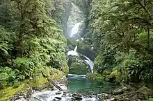About an hour and a half from this night's hut is a turn-off for Pompolona Hut where guided walkers stay the night. About 1 mile after this is the 🌍 St Quintin Falls, a 230m waterfall.