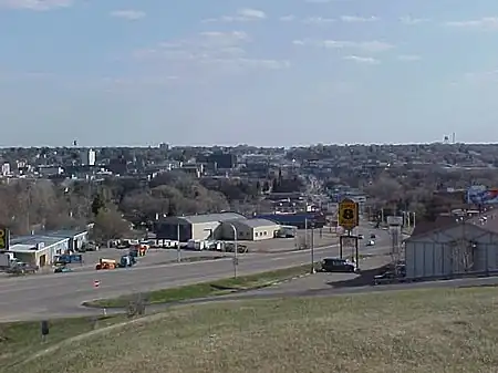 The Souris River goes through the middle of town, carving a valley in the middle of flat prairie. The town arose in 1880s as a stop along the Great Northern railway. During Prohibition the city became a nexus for alcohol smuggling. After World War II the city settled down into quiet suburbanation. There's a US Air Force base north of town. You can drive to Canada in just over an hour.