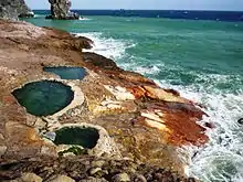 - Sakamoto Onsen (坂本温泉), Iojima (15 min from port by car). A natural seaside hot spring where the water bubbles out at 50°C, which is too hot to bathe in -- except during and after high tide, when seawater is mixed in, making the temperature bearable! At high tide, water depth can reach 1.5 m, so it doubles as a heated pool as well.