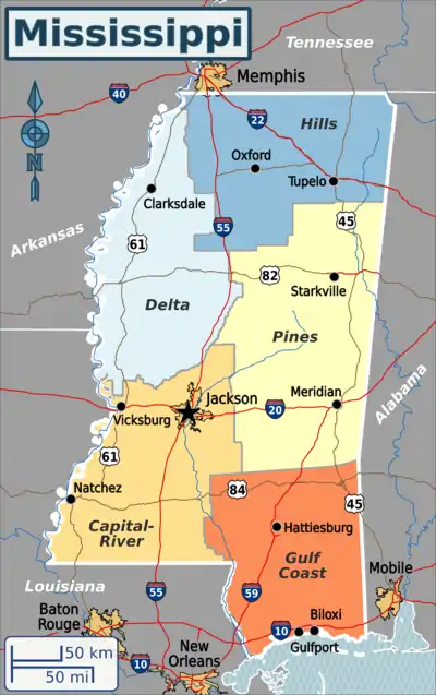 Most of Mississippi's western border (with Arkansas and Louisiana) is the mighty Mississippi River. Tennessee lies to the north and Alabama to the east, and it has a small coastline on the Gulf of Mexico to the south.