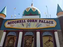 - 🌍 Corn Palace, 604 North Main, ☏ +1-800-289-7469, toll-free: +1 605-995-8430. Memorial Day through Labor Day: 8AM-9PM Daily; Hours may vary during the Corn Palace Festival. April, May, September & October: 8AM-5PM daily; November March: 8AM-5PM M-F. The original palace was built in 1892 in order to display the fertility of South Dakota's soil. The current building is the third incarnation and was built in 1921. Each year a new mural designed by local artists related to life in South Dakota is created on the exterior of the palace. The murals are created from a lot of corn, grasses, grains, straw, oats, etc. Inside the palace there is a stage and arena for sporting events. Each year there is a Corn Palace Festival that takes place in front of the Corn Palace. Free.