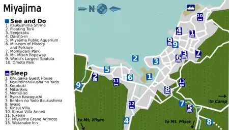 - 🌍 Miyajima Public Aquarium (宮島水族館), 10-3 Miyajima-cho, ☏ +81 829-44-2010. Daily 08:30-17:00. A collection of more than 380 sea creatures and daily animal events such as sea lion shows and photo opportunities with penguins. It's worth a stop if you have restless kids in tow — about a 20-minute walk from the pier. ¥1420.