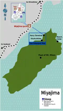 Miyajima can be reached by sea from Hiroshima etc. The main ferry terminal on the mainland is 🌍 Miyajimaguchi (宮島口) , which can be reached from JR Hiroshima station either by train (30 min, ¥420) or tram line #2 (70 min, ¥270). The tram line also passes by the Peace Memorial Park.