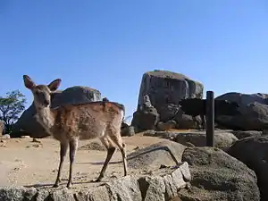 Tame deer amble around the island, harassing tourists for food (and all things paper, which they think is food). While somewhat more restrained than their counterparts in Nara, they're still eager for a hand-out. In the past, waffle-like wafers and pellets could be bought to feed them. However, a feeding ban is now in place, which has led to declining numbers — and increased boldness among the remaining deer, who are willing to root in around bags or backpacks for food (even while said bags are being worn). Further up on Mt. Misen, there are a few deer who have not had their (sharp) antlers removed, so take care if you see one.