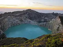 Kelimutu is a volcano on the island of Flores in Indonesia. Kelimutu is Keli=Mount and Mutu=Boiling means mount is always active. It is a good base for a trip to the coloured craters of the volcano. There are three craters which are usually dark red, green and light green, but the colours are not fixed and depend on the activities of the volcano, so the colour changes from lighter or darker. The similar Kawah Putih (White Crater) near Ciwidey on the island of Java has only one lake, with light green to white colour.