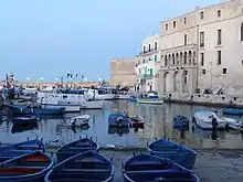 - Trattoria del Porto, via porto 17, ☏ +39 080 4107431, fax: +39 0808872429, trattoriaporto@virgilio.it. M W-Sa 19.00-00:00, Su 12:00-14:00, Tu closed. Taste of Apulia in the quiet atmosphere of the old city. €15-35.