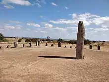 Reguengos de Monsaraz (/ʁɨˈɣẽɡuʒ ðɨ mõsɐˈɾaʃ/, rrih-GEHN-goozh thih mohn-suh-RAHZH) is one of the oldest Portuguese settlements of the southern Portugal, occupied since prehistory. Examples of permanent habitation include hundreds of megalithic monuments. These include the neolithic remains of: Megalithic Monuments of Herdade de Xerez, Olival da Pega Dolmens, Menhir of Bulhoa, Rocha dos Namorados Menhir and Outeiro Menhir. The hill, on which the main settlement is located, was a prehistoric fortification, or castro, that was the basis of pre-Roman occupation and funerary temples, carved from the local rock.