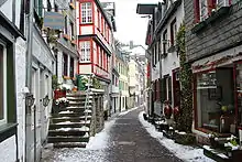 The ancient atmosphere of the town, with its countless traditional houses and cobblestoned streets, and its setting in the lush green surroundings, is Monschau's main attraction. Over 300 buildings are listed as monuments.