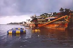 - Jimmy Buffet's Margaritaville, Gloucester Ave. 11AM-?. A tourist spot on the "hip strip" Gloucester Avenue. Their Jerk and Curry Chicken are excellent. They have entertainment, a hot tub, a 110-foot water slide that leads you into the ocean where there is also a water trampoline. The gift shop, with a wide variety of souvenirs including t-shirts, shorts, hats, shot glasses, and key chains. It is about 15 minutes from the resort areas.