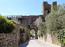 The more or less circular walls with a total length of about 570 metres were built between 1213 and 1219, following the natural contours of the hill. There are fourteen towers on square bases set at equidistance, and two portals or gates. One gate, the Porta Fiorentina, opens toward Florence to the north, and the other, the Porta Romana, faces Rome to the south. The main street within the walls connects the two gates in a more or less straight line.