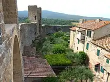 The main piazza, the Piazza Roma, is dominated by a Romanesque church with a simple, plain facade. Other houses, some in the Renaissance style, were once owned by local nobles, gentry and wealthy merchants facing into the piazza. Off the main piazza, smaller streets give way to public gardens fronted by the other houses and small businesses of the town. In more hostile times, these gardens provided vital sustenance when enemies gathered without.