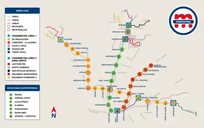 In 2021, line 3 of the system opened which connects a major hospital in San Nicolas with downtown and is operated together with line 2 in a rough u-shape.