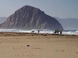 - 🌍 Morro Rock. The great sight is the surf at the base of Morro Rock (called "The Rock" locally) which is the lava plug remnant of an ancient volcano. A bayside walk connects the Embarcadero waterfront to the ocean and harbor entry. The jetty that guards the bay mouth is a popular but dangerous surf vantage point, and one must take care with rogue waves which have killed visitors here. The Rock is a protected Native American shrine and home to endangered peregrine falcons.