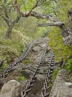 • From the saddle point Hatchōzaka (八丁坂) starts an endless series of tiring wooden steps built into the mountainside to prevent erosion and landslides. Note that you will see a set of chains here, but the 74-m climb will only get you to a narrow peak of rocks with a beautiful view, and then you must climb back down.
