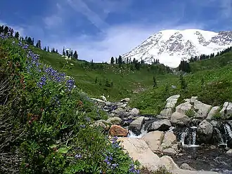 - Summerland Trail. (8.5 miles). From the trailhead three miles from the White River entrance this trail ascends 1500 feet. Starting in forest, it rises to the open but brushy upper valley of Fryingpan Creek where hikers find good views of Mount Rainier. Shortly after crossing the creek at a small cascade, the trail climbs steeply for another 0.5 mile before reaching the open subalpine meadows of Summerland. This is one of Mount Rainier's most crowded trails, hosting several hundred hikers per day on a nice summer weekend, so be aware that parking can be a problem. Mountain goats and elk are frequently sighted along this trail.
