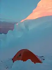 A tent is often the primary place to sleep on mountaineering journeys. It can be used where there are no huts, and when the hut cannot be reached because of foul weather or other circumstances. On many climbs there are no convenient places to put up the tent, so special arrangements are needed. High winds are also an issue.