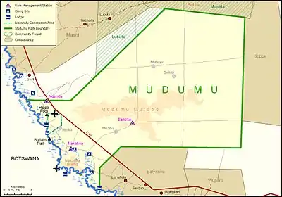 The park's western boundary is on the Kwando river. It covers an area of 737 square kilometres (285 sq mi).