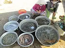 - 🌍 Fishing harbor (Lang chai Mui Ne). If you are staying on the resort strip in Ham Tien or Phu Hai wards, don't miss out to visit this once quiet "fishing village" but nowadays bustling town, at the northeast end of Mui Ne Bay. The coastal road leads straight into the town (with a left turn required at the first red light to continue up the coast). If you arrive during the dry "winter" season, don't miss the harbor overlook at the entrance to Mui Ne with a splendid view of hundreds of colorful fishing boats moored in the bay. The boats move to the other side of the "Shelter Cape" (English translation of "Mui Ne") during the monsoon season from May through October, when the wind direction changes from mainly northeast to mainly southwest. If you take your transport just down to the water, you will reach the fishing harbor, where you can purchase fresh seafood (if you have any means to cook it) or purchase steamed crabs, shellfish, etc. to eat on the spot from local vendors. Walking along the beach, you'll pass by fishermen sorting out their catch, ship-wharves and, at the southern end of town, a section where clams have been rid of their shells for many years, so the sand on the beach is by now substituted with littered shells. Be prepared to encounter piles and stretches of rubbish on the beach.