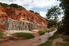 - 🌍 Fairy Stream (Suoi Tien). The Fairy Stream is a little creek that winds its way through bamboo forests, boulders and the dunes behind the village, in parts resembling a miniature version of the Grand Canyon. Local children will want to accompany you to show you the way (and of course earn a dollar or so), but since you're just following the stream, there's little need. For the most part, the stream is about ankle-deep and no more than knee-deep even at its deepest. It is sandy with few stones and can be walked comfortably barefooted. You can climb up the red sand hills overlooking the river valley and even walk there parallel to the river, however, the sand may be hot on a sunny day, so bring some footwear. Walking upstream for about 20 minutes, you will reach a small waterfall into at most waist-deep water, great to take a refreshing bath before heading back. To reach the stream, head along the main road towards the east until you cross a small bridge. The stream is underneath, you will see a sign pointing towards a path to the left, go that way to reach an easy place to enter the stream. By bicycle it's about 15 minutes from the main resort strip and shouldn't be more than 20,000 dong by xe om. You can enter somewhere along the beach or at the bridge where you will be charged 10,000 dong for entry (although entrance is officially free) and 5,000 dong for motorcycle parking.