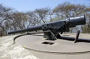 Stupas. Apart from the Hindu caves, Elphanta Island also houses two Buddhist stupas. In order to visit them, one has to continue beyond caves 6 & 7. One of the stupas is located on a hill top and the other on the coast. Both are extremely difficult to locate and are hardly visited by tourists. Cannons: Elephanta Island also houses two gigantic cannons mounted on rotating platforms. These strategically placed British cannons date back to the time of Edward VII. To reach the cannons, one has to walk out of the cave complex and head left. A 15 mins walk along a winding trail will lead to the first cannon, a couple of minutes more walk will lead to the second cannon. There are also a couple of ruined masonry structures near the two cannons.