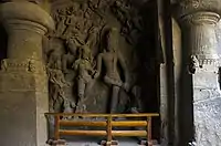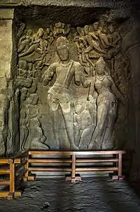 • Gangadhara Shiva (no. 5 on map): This panel is located right of Trimurti. The panel represents the story of Lord Shiva bringing river Ganges from heaven to earth. The panel shows Lord Shiva and Parvati standing side by side. In between them stands a gana (dwarf jester). Baghirath can be seen kneeling down on the lower left corner. Here also, the background contains an amazing collection of minor sculptures, which include Bramha and Vishnu.