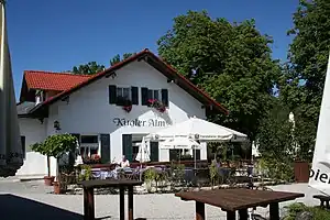 - 🌍 Kugleralm, Linienstraße 93, Oberhaching (S-Bahn S5: Furth), ☏ +49 89 613 90120, info@kugleralm.de. Apr-Oct. Trad 2400-seater beer garden in Oberhaching south of Perlacher Forst, serving Spaten beer. In 1922 this was the launchpad of the Radler, half beer half lemonade, a "shandy" in English. The legend goes that they were mobbed by cyclists on a hot summer day. The beer ran low so they eked it out by diluting with lemonade, and claimed this was a special mix for cyclists (Radler) as it was lower on alcohol. Such blends were already documented from mid 19th century.