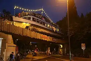 - 🌍 Alte Utting, Lagerhausstraße 5 (U-Bahn: U3, U6 Poccistraße or Implerstraße, Bus: 62,132 Lagerhausstraße), ☏ +49 89 707770, info@alte-utting.de. Tu-Th 16:00-00:00, F 16:00-02:00, Sa 11:00-01:00, Su 11:00-22:00. This ship was a steamer on a Bavarian lake until 2016. It now perches on a railway bridge, an offbeat venue undecided whether it's The Flying Dutchman or The Flying Scotsman. It has beer, grills, live music, cabaret and disco, a beer garden, and from the upper deck surely the most unusual view over Munich.