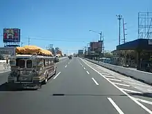 If you board express service jeepneys using SLEX, they will exit at Filinvest City, and you will either get down at Festival Alabang (south wing) or South Station. Jeepney fares are at ₱10 to any destination in the city due to its sheer size, but a trip on one plying National Road can last 30 minutes due to perennial congestion. Routes can be seen on the front and sides of the vehicle.