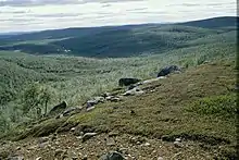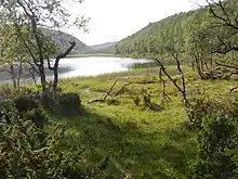 The southern part of the area is lowland dominated by fell birch, with bogs, some old pine woods and some of the fells extending above the tree line. Going to the north the terrain gets higher and even the fell birch has to seek shelter in valleys. The open rolling fell landscape of the central and north parts of the area is what most hikers come here to enjoy. The highest peak, Kuárvikozzâ, reaches a modest 590 metres, 250 metres above its surroundings.