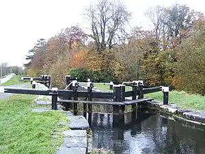 - ๐ Canal Harbour: the Naas Branch is a spur off Grand Canal completed in 1788. It branches off at Soldier's Island near Sallins 3 km north, runs into town ascending 3 locks to the basin, then makes a hairpin turn and heads west towards Corbally. It carried mostly mill goods; its extension into Wicklow never happened. It remains navigable (but check with Waterways Ireland) from Sallins to the basin and 1 km west then is blocked by R445. Beyond for 3 km is in water but derelict, acting as a feeder, then it disappears altogether beneath the motorway.