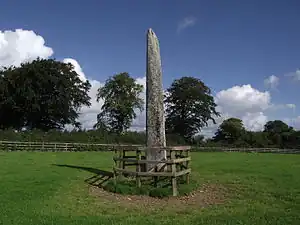 - Punchestown Longstone is a standing stone 7 m tall, just off Craddockstown Road at the north edge of the racecourse. It's of local granite and is a burial marker from the Beaker era, say 2000 BC - it toppled over in 1933 to reveal a burial cist, and in 1981 another cist was discovered 700 m east. Craddockstown or Forenaghts Great Stone at the racecourse entrance is 5 m tall and of similar date, as the wristband found in its burial cist was typically Beaker. The Topographia Hibernica of 1188 AD would have you believe that "giants brought it from the furthest parts of Africa into Ireland and set it up, partly by main strength, partly by artificial contrivances, in an extraordinary way . . . ".