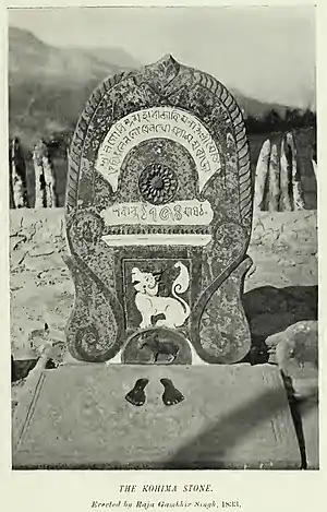 Among the very few records, one of the most important is the Kohima Stone Inscription, also known as the Gambhir Singh's Stone, that was erected by King Raja Gambhir Singh (alias Chinglen Nongdrenkhomba) of Manipur kingdom, in Kohima (Meitei: Thibommei), the capital of Nagaland in 1833 AD. The inscription mark the Meitei conquest and supremacy over the Naga Hills in 1832 AD. Manipuri King Raja Gambhir Singh conquered the whole Naga Hills with his military power of the Manipur Levy.