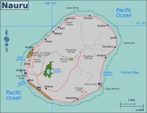 - 🌍 Anibare Bay, Anibare district (along the Ring Road). Anibare Bay is the sole exception to the rule cited above about the absence of the classic Polynesian "sandy beaches, cool ocean breezes, and pristine blue waters" experience on Nauru. Here you'll find a fine stretch of white sand surrounded by palm groves, deep and clean enough for proper swimming (among a fantasyland of beautiful coral pinnacles, no less). Anibare is also a great place for seeing the sunrise; at 166°E longitude, Nauru is among the first countries in the world to see a new day. The smaller of Nauru's two ports, 🌍 Anibare Harbour is at the southern end of the bay. Constructed in the early 2000s with Japanese capital, you can watch local fishermen bring their catch to land here.