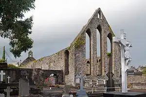 - 🌍 Franciscan Friary or Abbey was founded early 13th century. The Annals of Nenagh were written here 1336 to 1528 - they're biographies of local worthies. In spite of burning, smashing-up and the Reformation, a Franciscan community survived here into the 18th C; and even after that, they clung on as parish clergy. Only in 1817 did the last Franciscan priest die. The building is unusually long and thin, with no division into nave and chancel. It's "oriented" ie facing east, with an impressive east gable window, but since there's only one south-facing window the interior would have been gloomy most of the day. The ruin is still in use as a graveyard which you can visit any time, free.