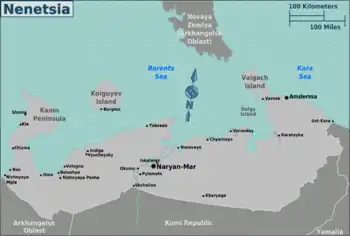 Nenetsia is a far flung region in Northwestern Russia on the Barents Sea, which borders Arkhangelsk Oblast to the southwest, Komi Republic to the south, and Yamalia to the east. The region is adjacent to the large Arctic islands of Novaya Zemlya.
